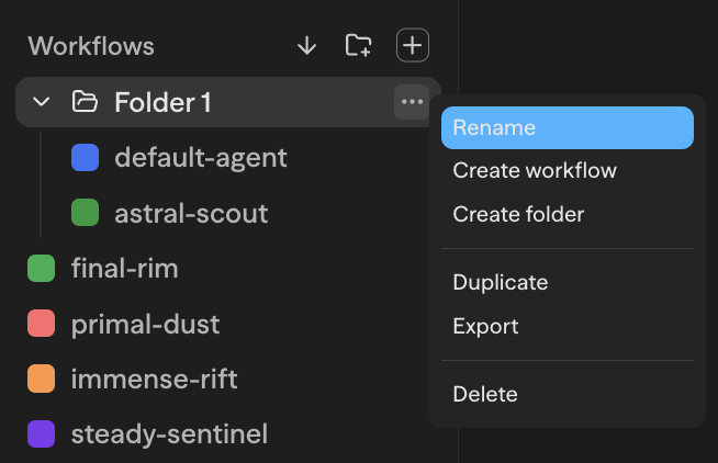 | Reorder / move workflows | Drag workflow up/down or onto a folder | |