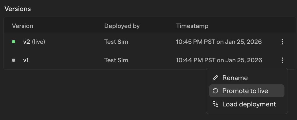 | Revert deployment | Access previous versions in Deploy tab → Promote to live | ![]() |