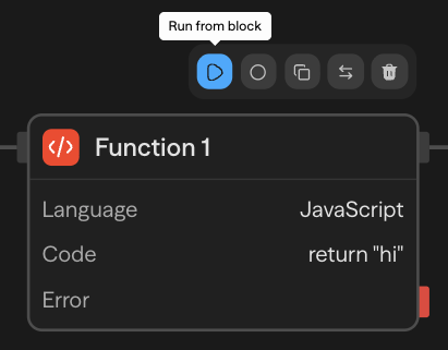| Run from block | Hover block → Click play button, or right-click → Run from block | ![]() |