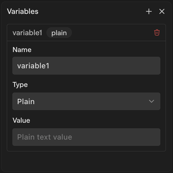 | Add / Edit / Delete workflow variable | Panel -> Variables -> Add Variable, click to edit, or delete icon | ![]() |