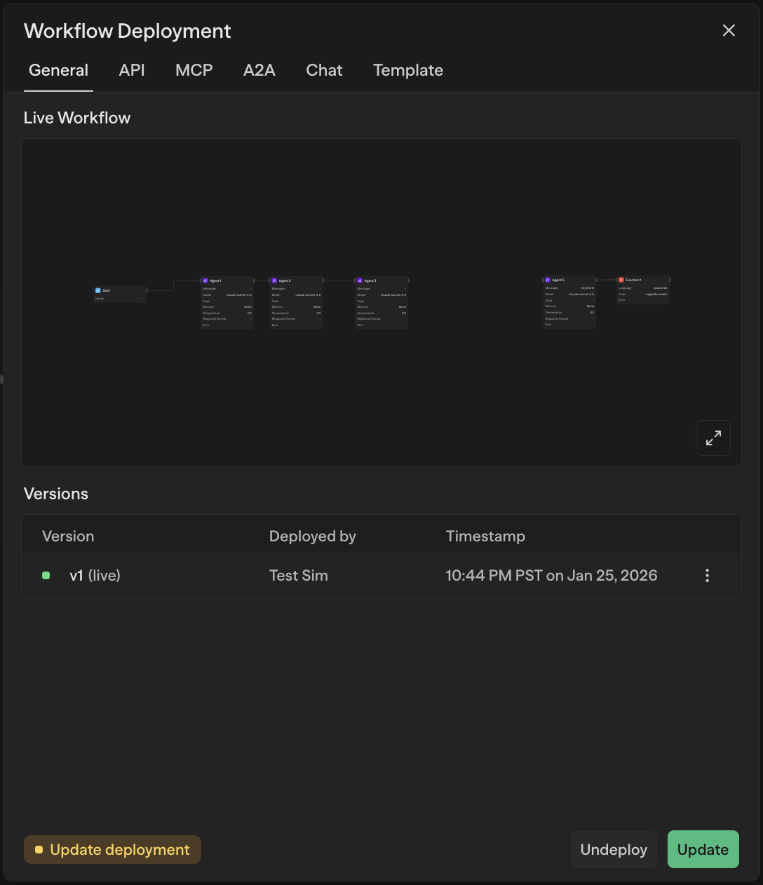 | View deployment status | Check status indicator (Live/Update/Deploy) in Deploy tab | ![]() |